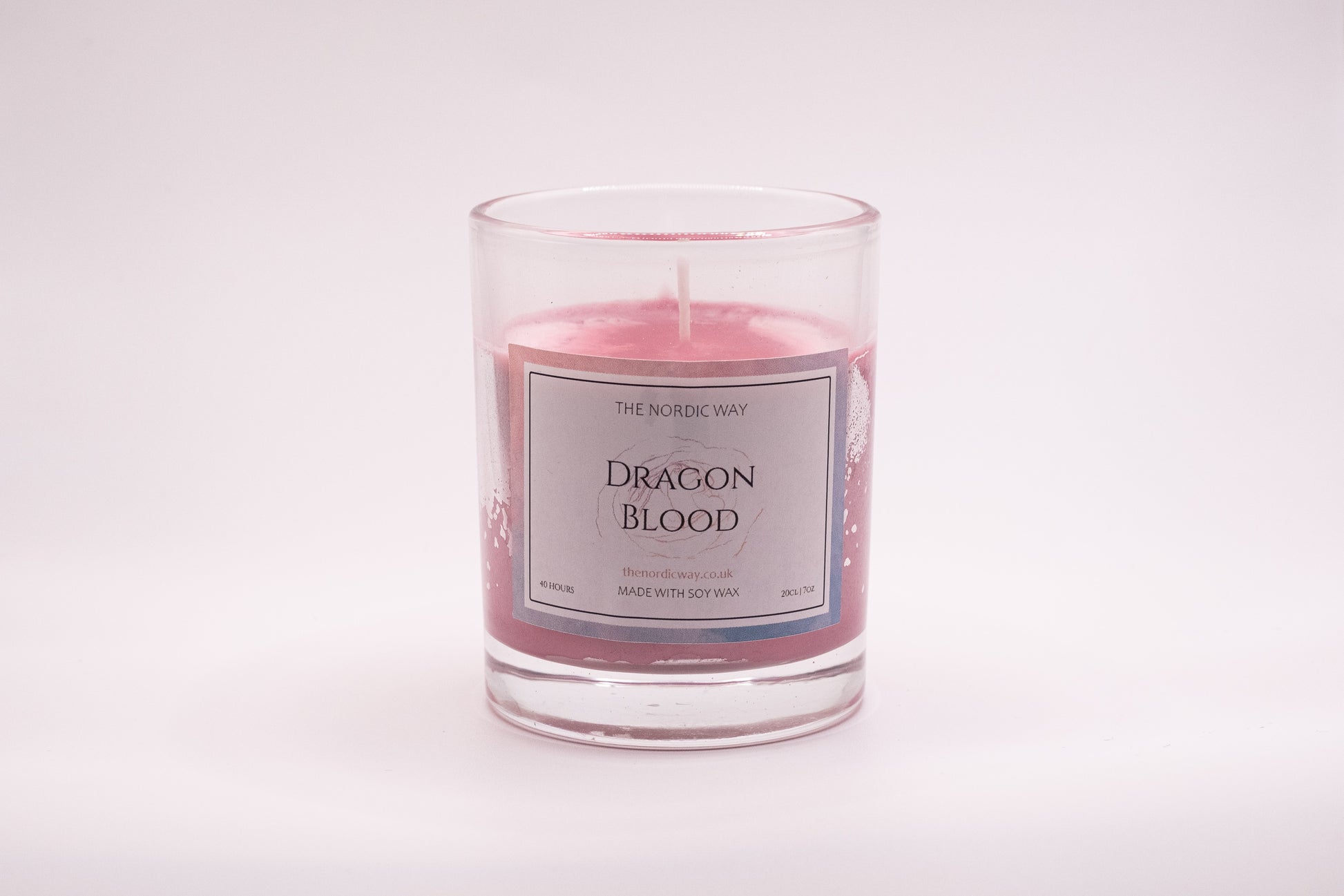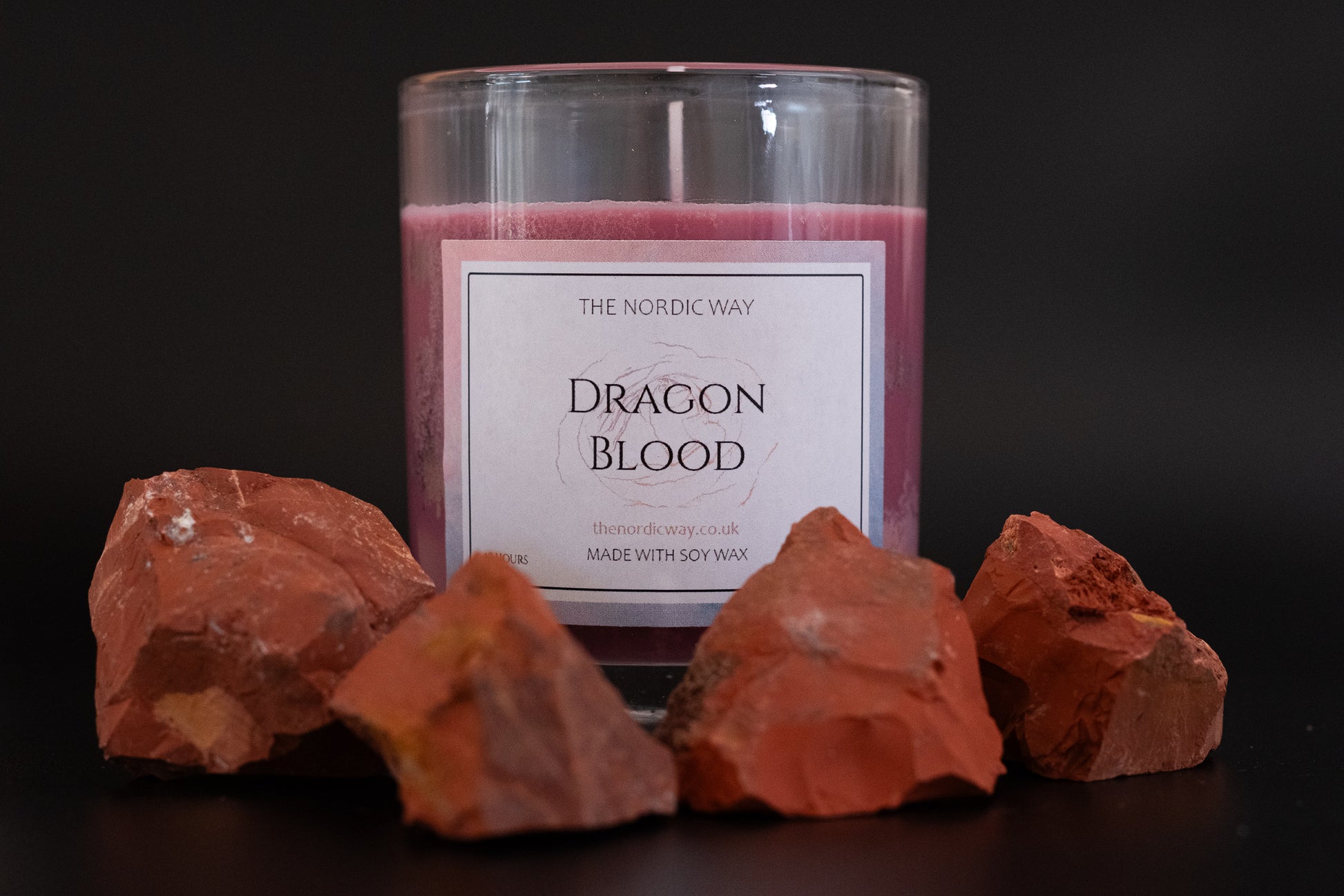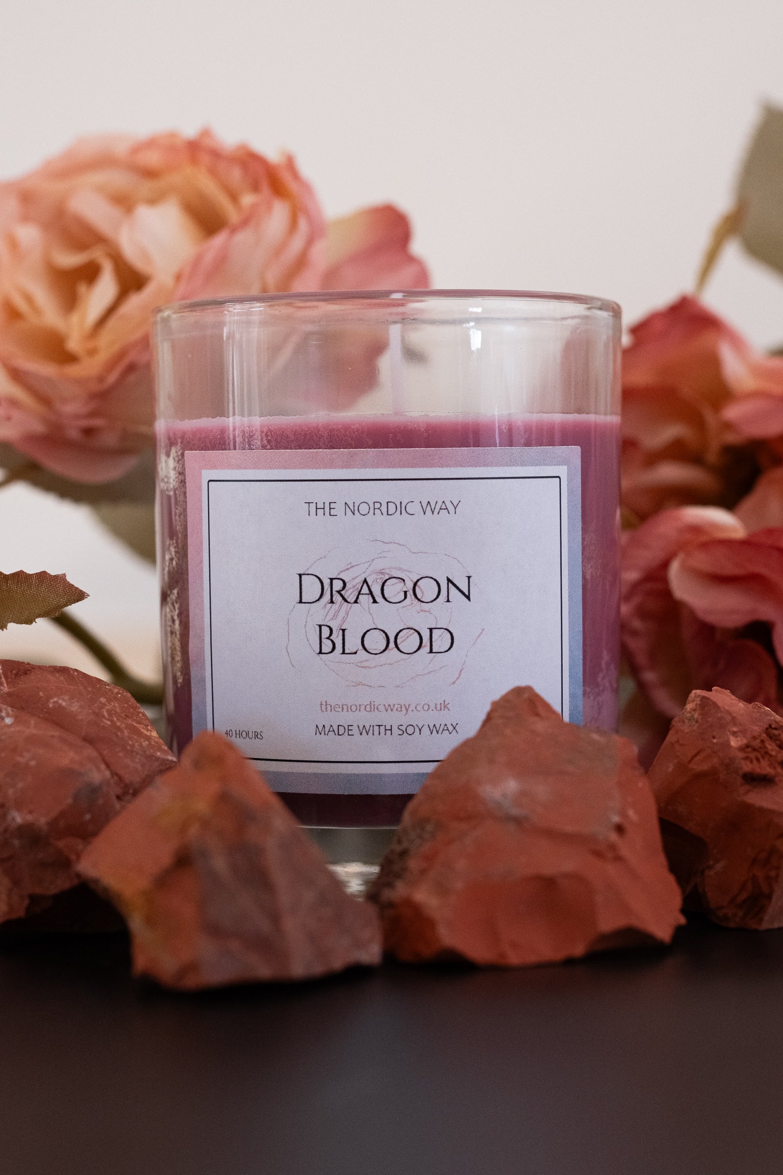 Fragrant candle with the scent of dragon blood. An exotic floral scent with base notes of amber, sandalwood, musk and vanilla. This fragrance is perfect for the bedroom or a special evening. Beautiful hot and cold throw that will fill your home with the scents that you love. Created with soy wax and fragrance oils that are vegan and cruelty free.